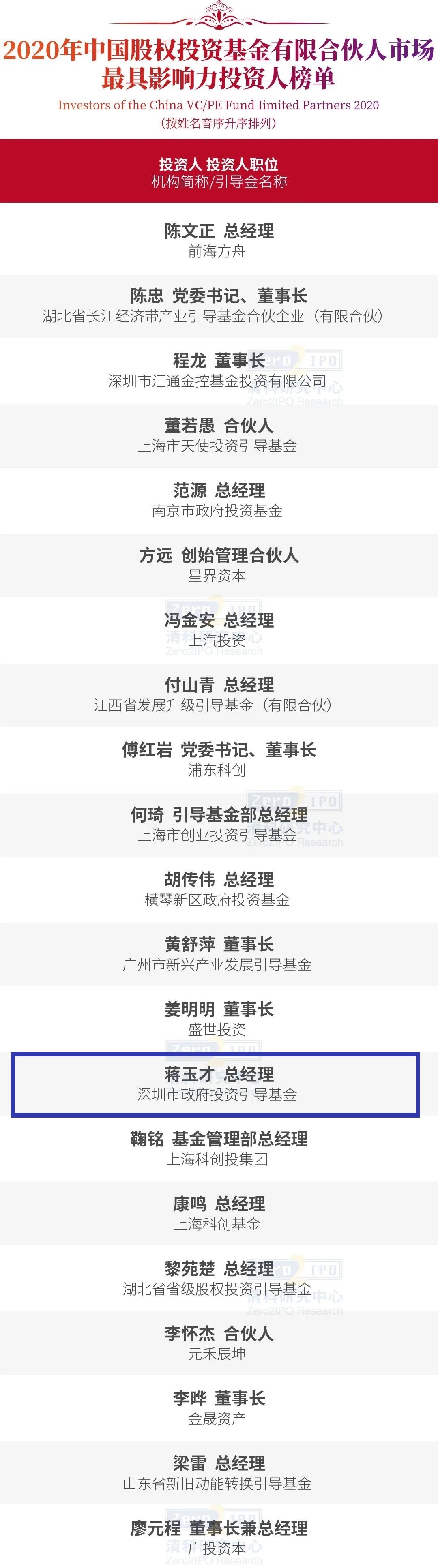 8月13日,在清科集团联合旗下投资界主办的第十四届中国基金合伙人峰会上,2020年中国股权投资基金有限合伙人榜单隆重揭晓,深圳市创新投资集团(简称“深创投”)受托管理的深圳市政府投资引导基金被评为“2020年中国政府引导基金30强”第一名,深圳市政府投资引导基金总经理、深创投副总裁蒋玉才被评为“2020年中国股权投资基金有限合伙人市场最具影响力投资人”。