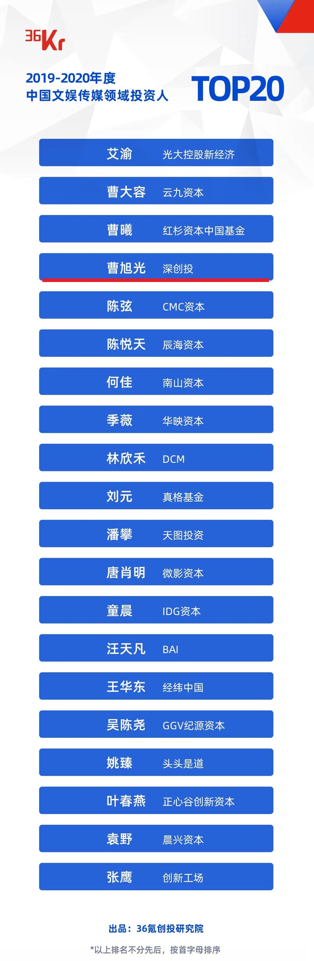 “2019-2020年度中国文娱传媒领域投资人TOP20”