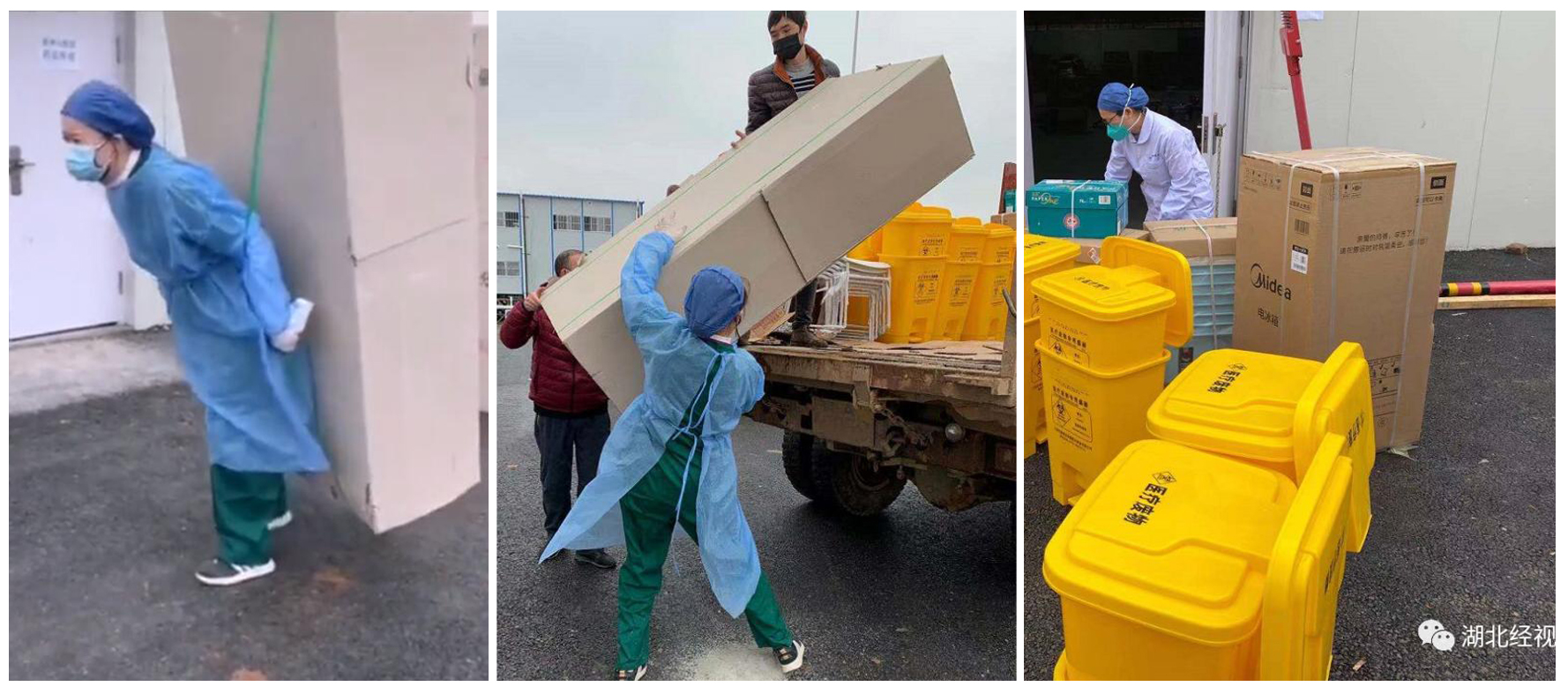 (雷神山医院医护人员辛苦搬运物资,截图原图来自“湖北经视”微信公众号)