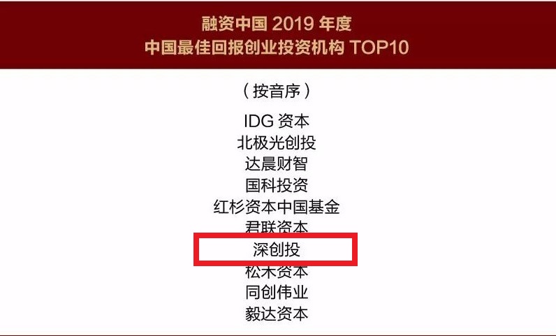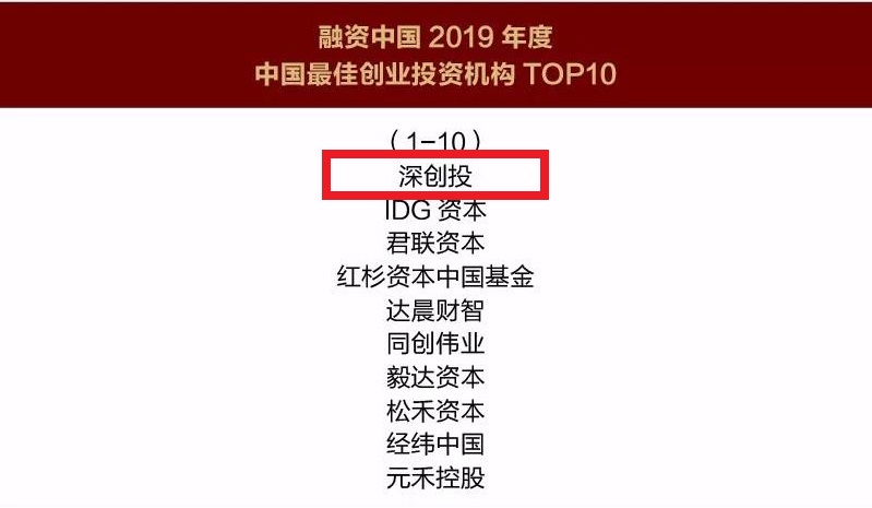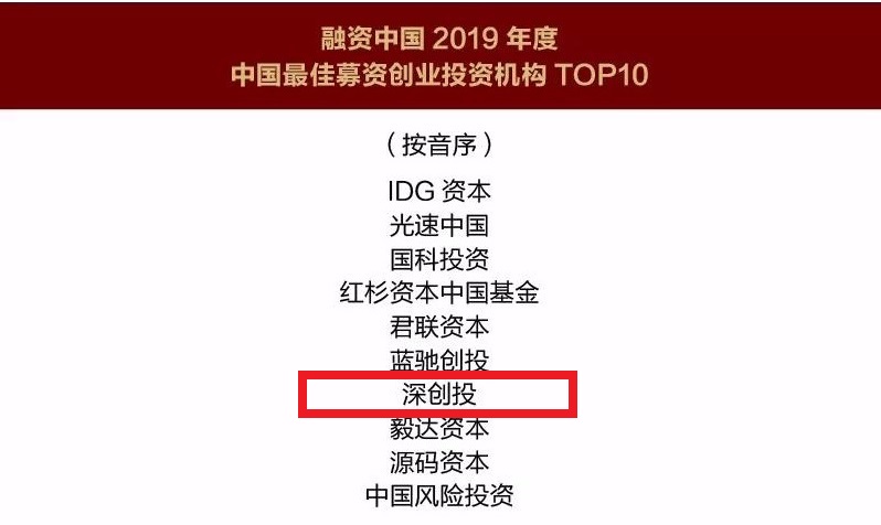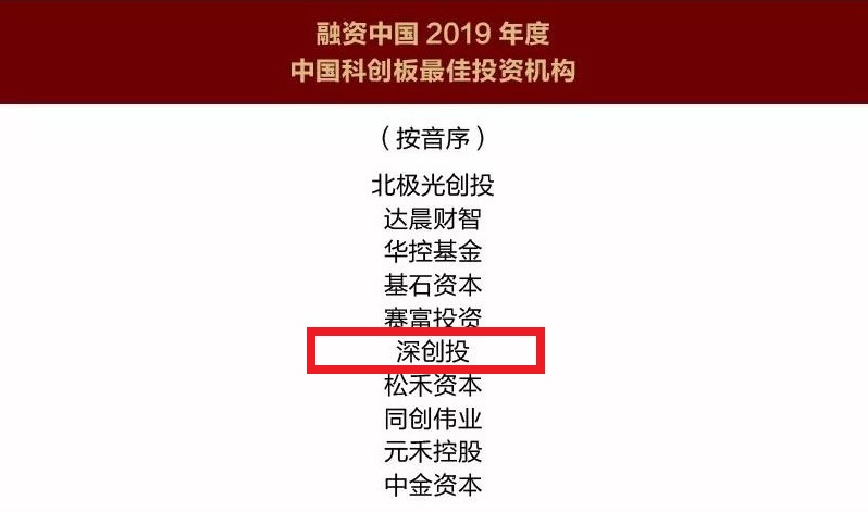 深创投获评融资中国“2019年度中国最佳创业投资机构TOP10”第一名,荣获“中国股权投资二十年成就奖”,并获评“2019年度中国最佳募资创业投资机构TOP10”、“2019年度中国最佳回报创业投资机构TOP10”、“2019年度中国科创板最佳投资机构”;