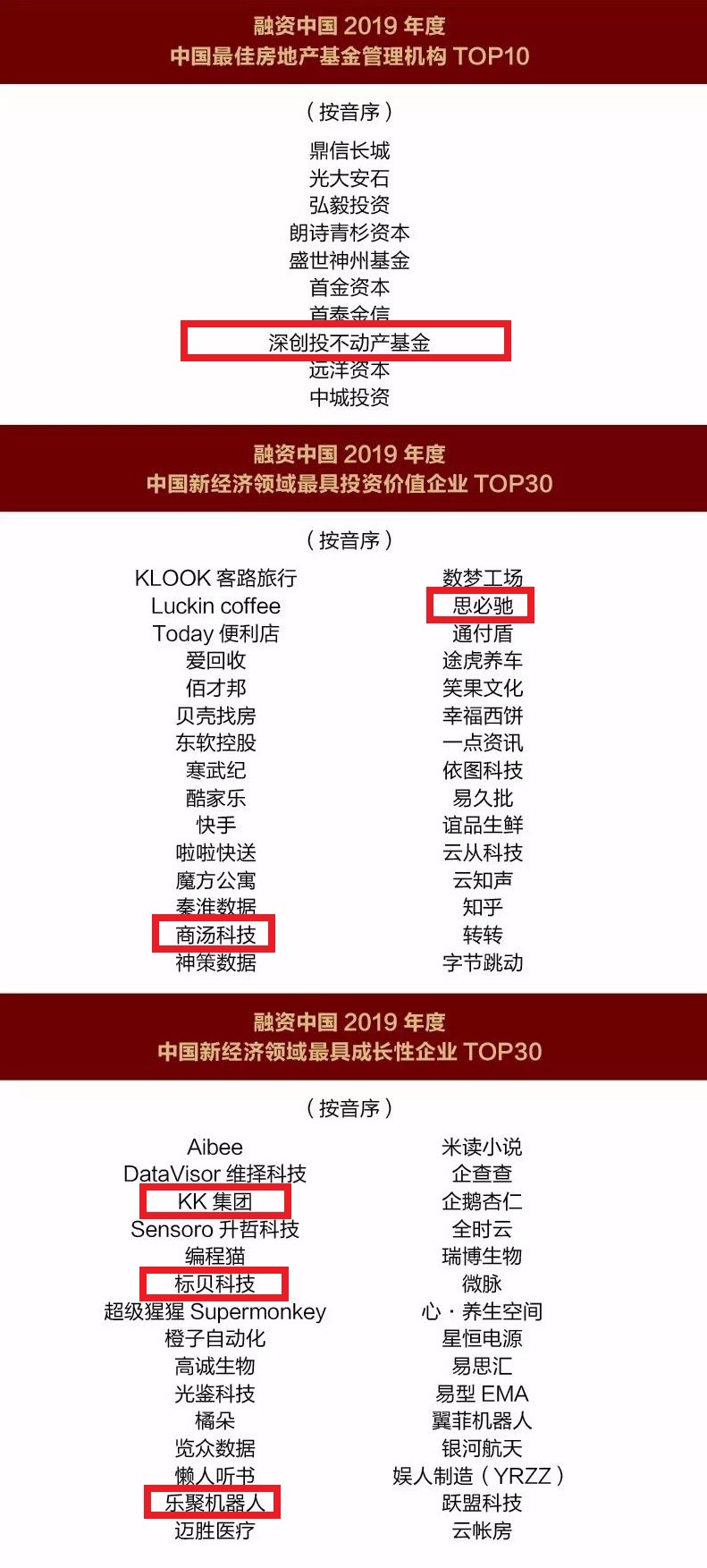 深创投投资企业“思必驰”、“商汤科技”获评“2019年度中国新经济领域最具投资价值企业TOP30”,投资企业“KK集团”、“标贝科技”、“乐聚机器人”获评“2019年度中国新经济领域最具成长性企业TOP30”。