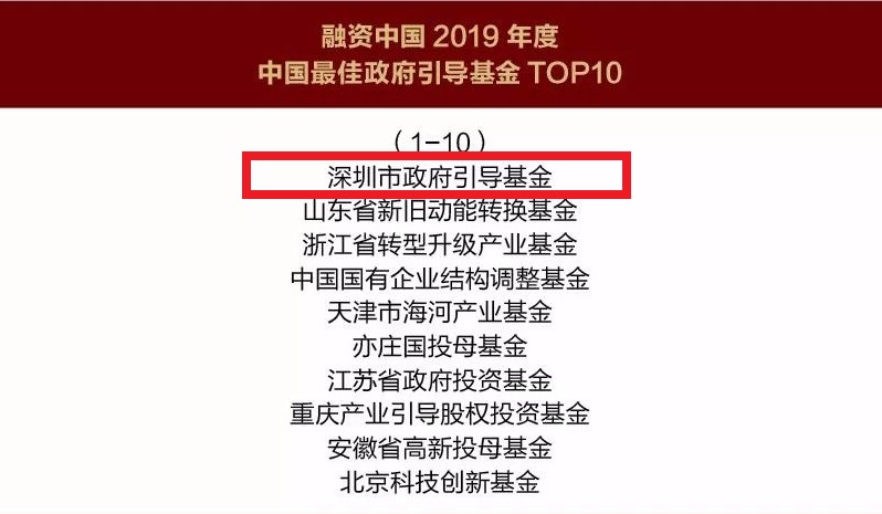 深创投管理的深圳市政府引导基金获评“2019年度中国最佳政府引导基金TOP10”第一名;