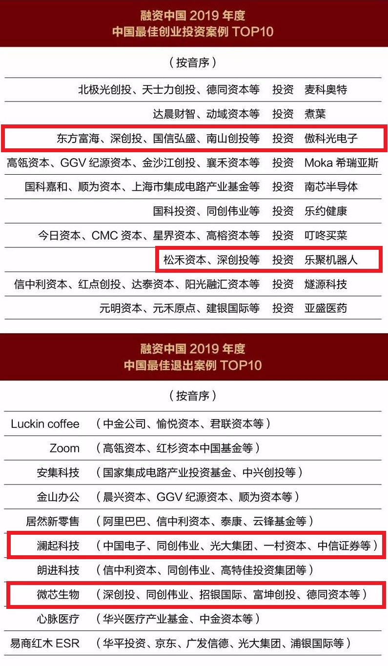 深创投投资案例“傲科光电子”、“乐聚机器人”获评“2019年度中国最佳创业投资案例TOP10”,投资案例“澜起科技”、“微芯生物”获评“2019年度中国最佳退出案例TOP10”。