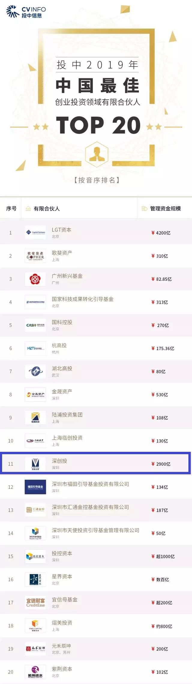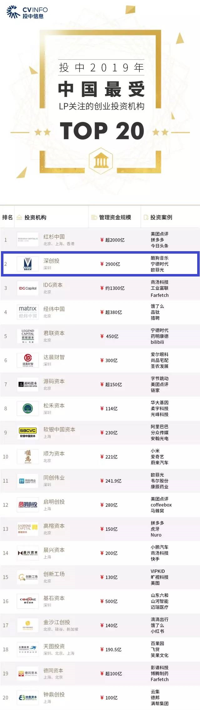 投中“2019年中国最受LP关注的创业投资机构TOP20”第二名