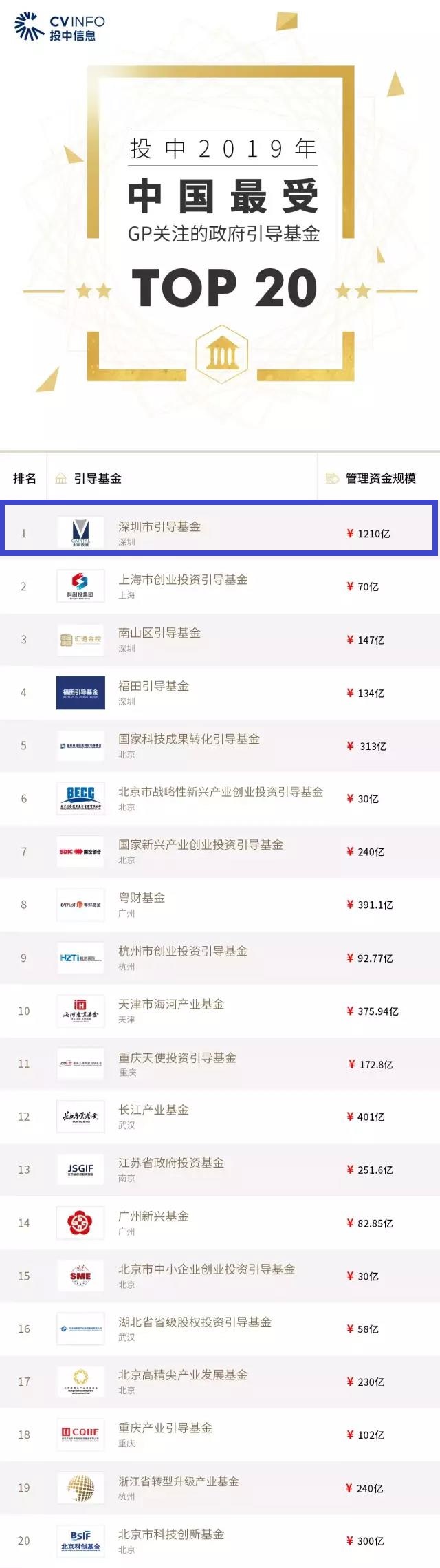 投中“2019年中国最受GP关注的政府引导基金TOP20”第一名