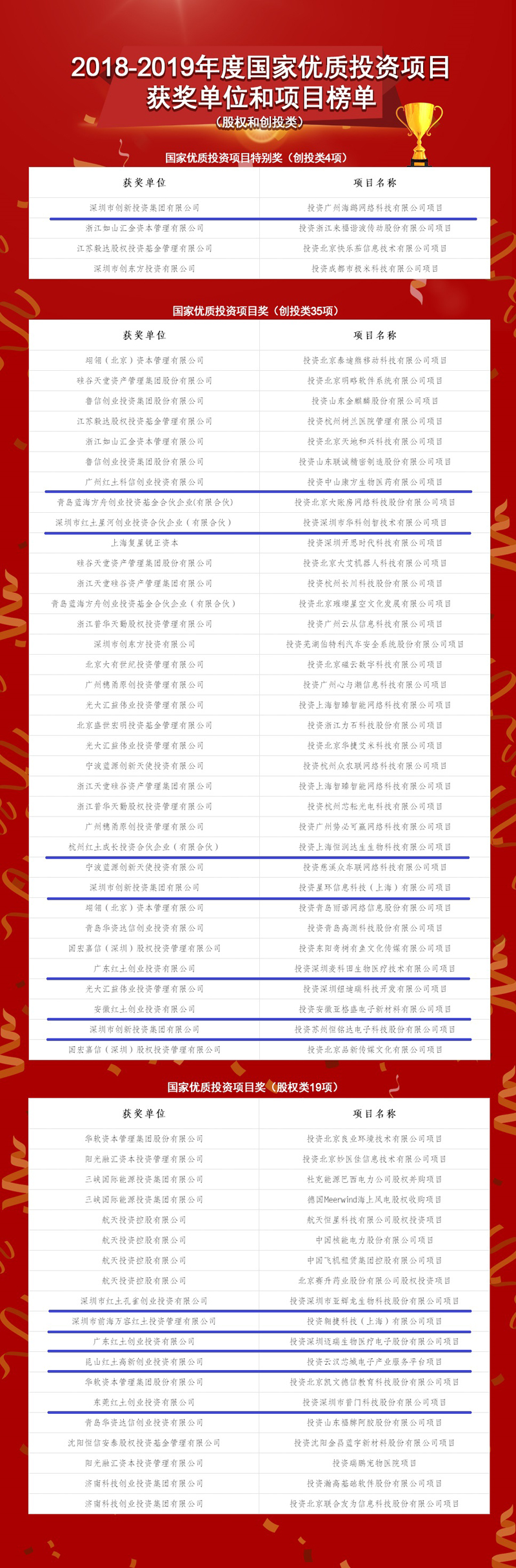 本届表彰共4个创业投资类项目荣获国家优质投资项目特别奖,深创投申报的投资项目广州海鹚网络科技为其中之一;54个创投及股权投资类项目获国家优质投资项目奖,其中深创投及旗下基金投资项目占12席,分别是:深创投申报的星环科技、恒铭达项目,广州红土科信基金申报的中山康方项目,红土星河基金申报的华科创智项目,杭州红土成长基金申报的恒润达生项目,广东红土基金申报的迈瑞医疗、麦科田项目,安徽红土基金申报的亚格盛项目,红土孔雀基金申报的亚辉龙生物科技项目,前海万容红土基金申报的翱捷科技项目,昆山红土基金申报的云汉芯城项目,东莞红土基金申报的普门科技项目。