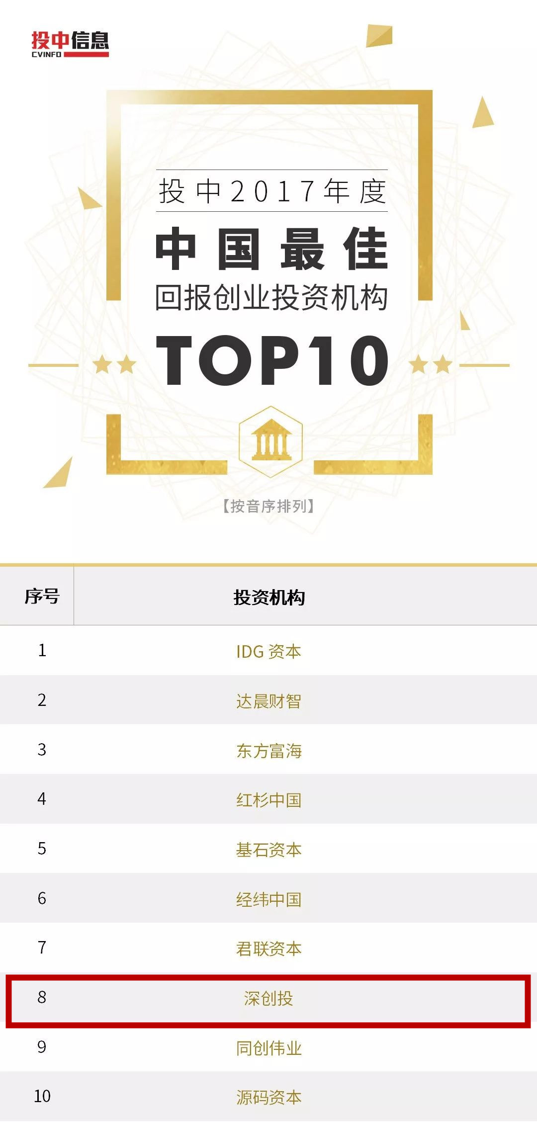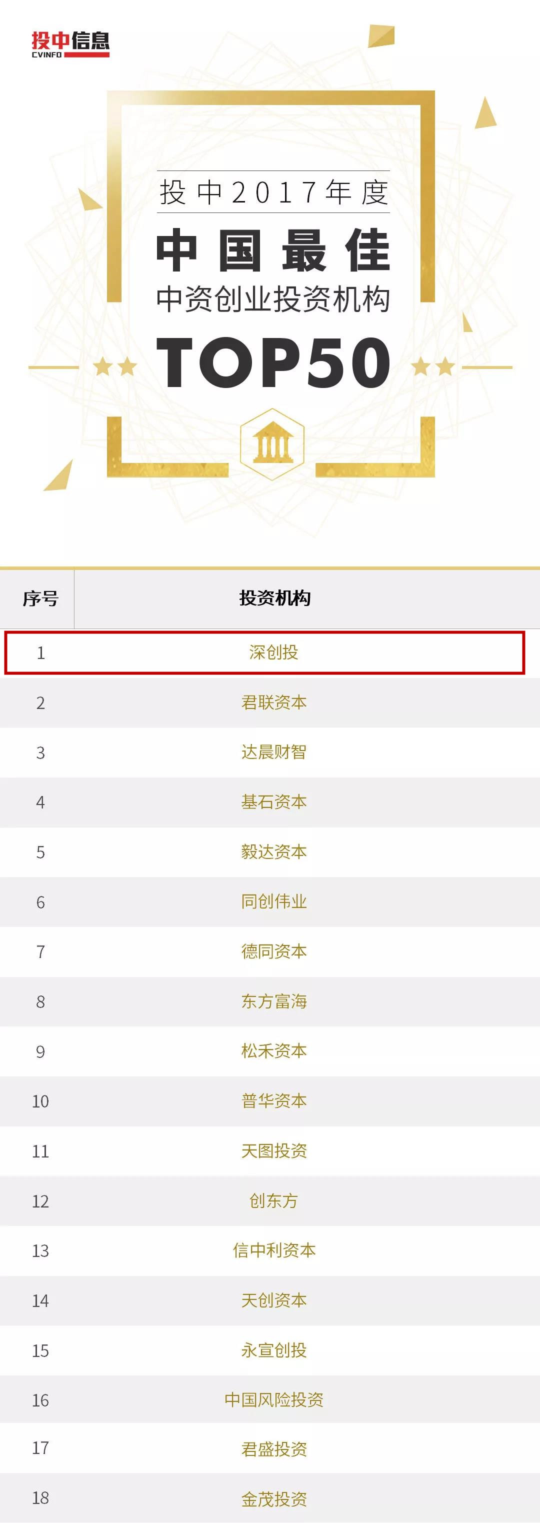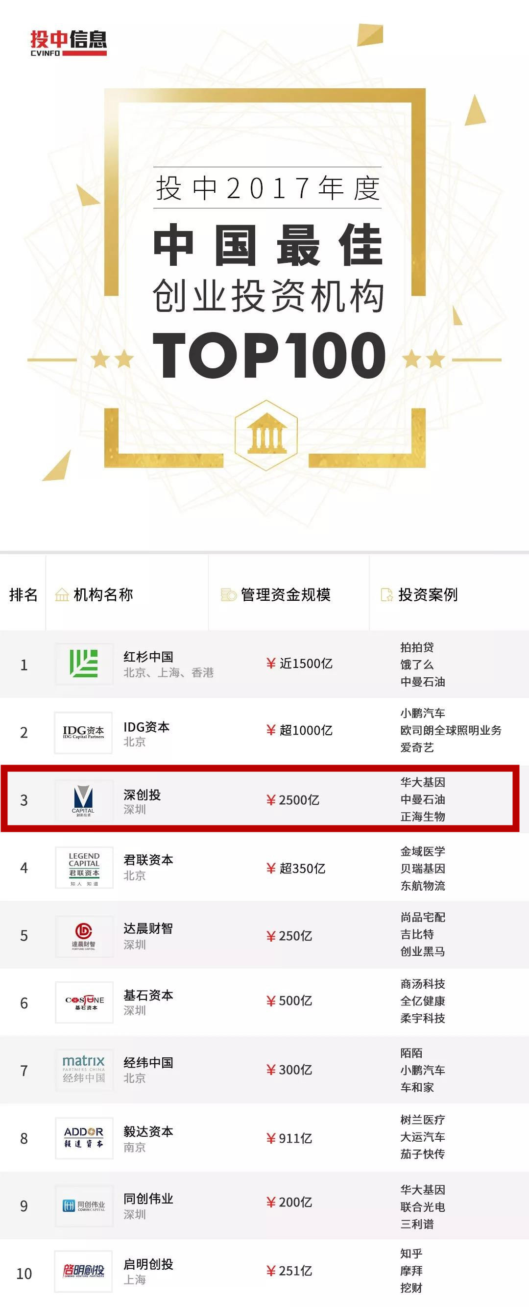 “投中榜”评选已超过10年时间,是创投业内公认的最为权威、客观、全面的榜单之一。历年来,深创投均在投中榜单中位居前列,显示了良好的行业地位和投资业绩。