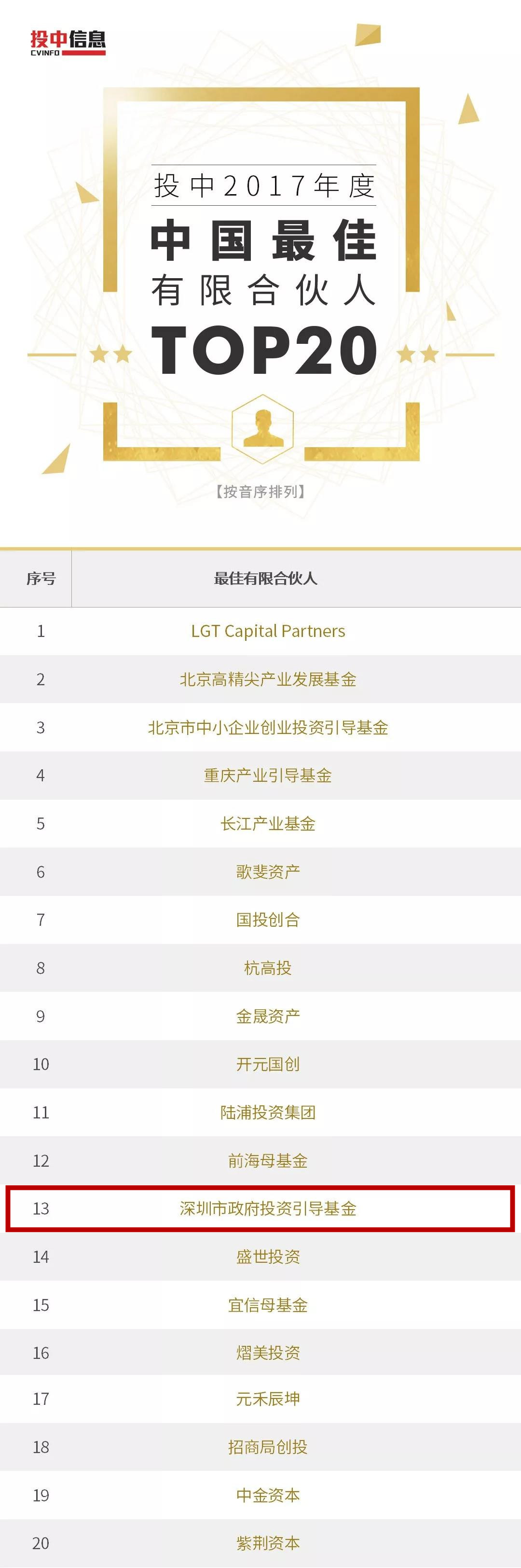 深创投管理的深圳市引导基金被评为2017年度“中国最佳有限合伙人top20”(未排名)。