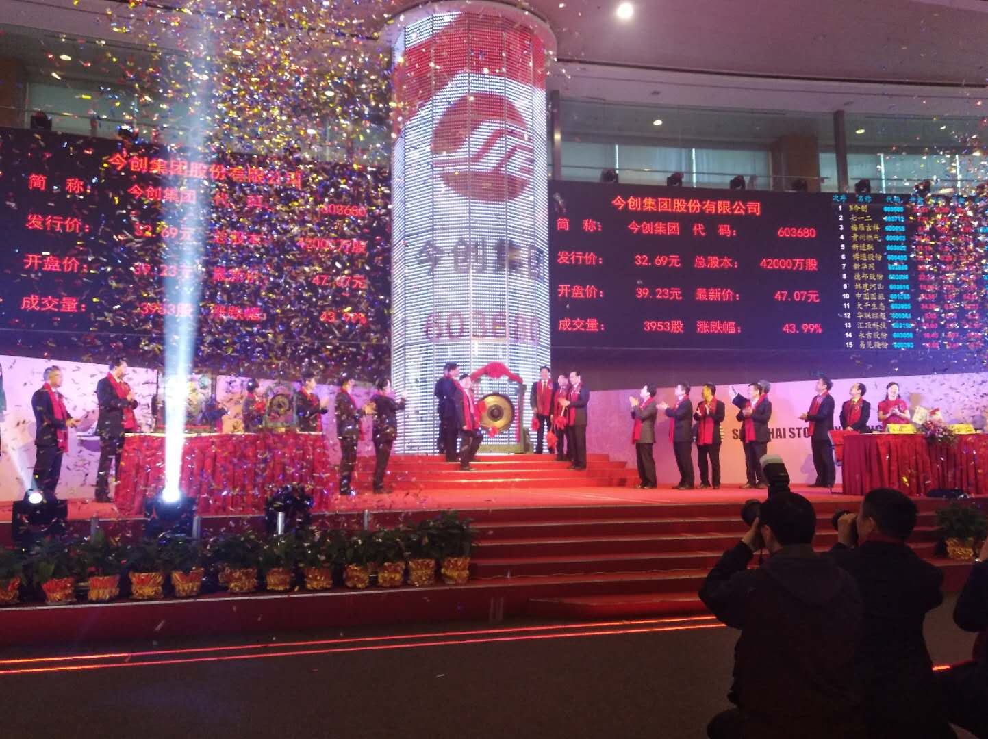本次公开发行,今创集团共发行人民币普通股4200万股,发行价32.69元/股。上市首日,今创集团以47.07元/股涨停价收盘(涨幅44%)。