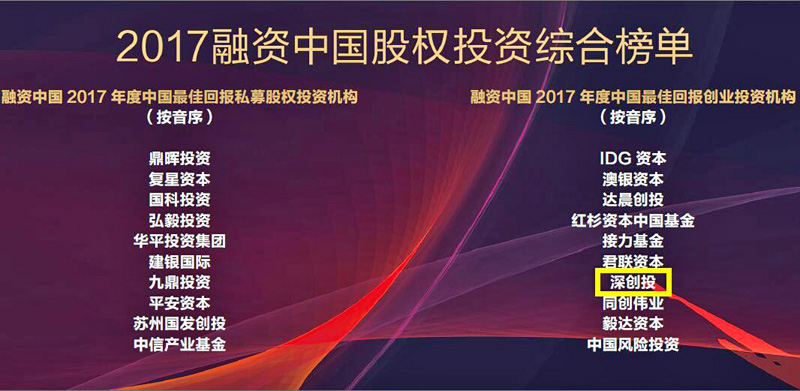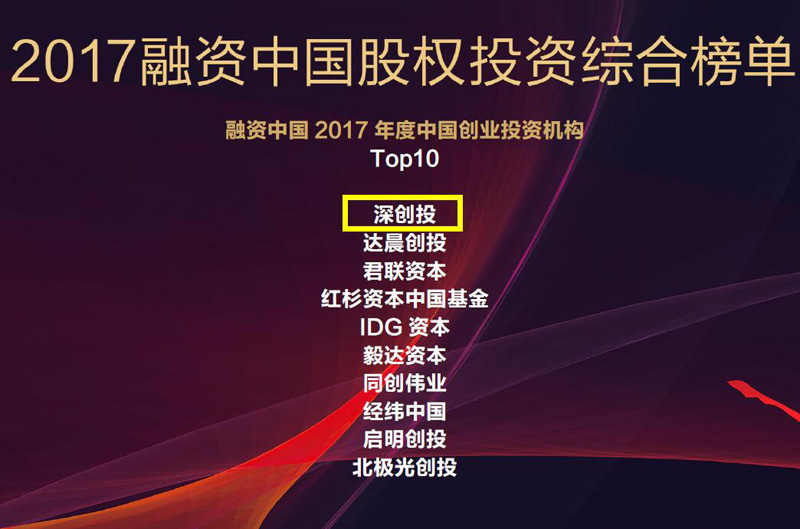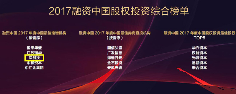 深创投获评2017年度“中国创业投资机构Top100”第一名、“最佳回报创业投资机构”、“最佳定增机构”;