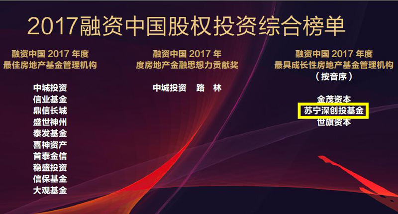 深创投不动产基金管理(深圳)有限公司与苏宁云商全资子公司江苏苏宁物流有限公司共同投资设立的苏宁深创投基金管理(南京)有限公司(简称“苏宁深创投基金”)获评2017年度“最具成长性房地产基金管理机构”;