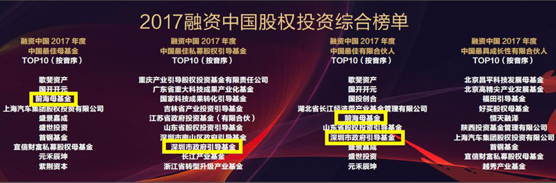 深创投担任唯一机构合伙人的前海母基金获评2017年度“中国最佳母基金TOP10”、“中国最佳有限合伙人TOP10”;