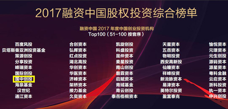 深创投专门发起设立的深圳国中创业投资管理公司(简称“国中创投”,中小企业发展基金(深圳有限合伙)的管理人)获评2017年度“中国创业投资机构Top100”;