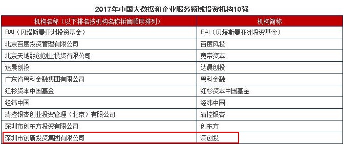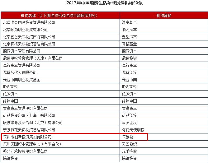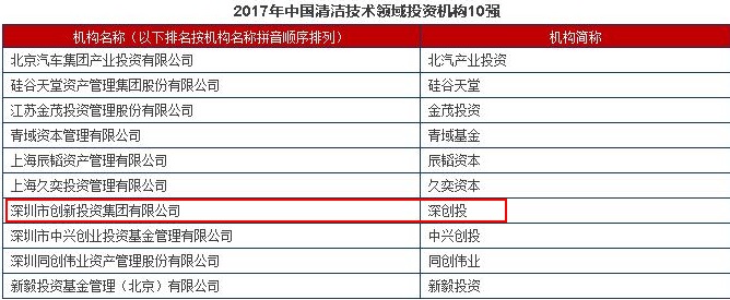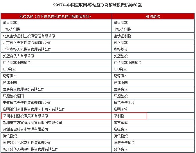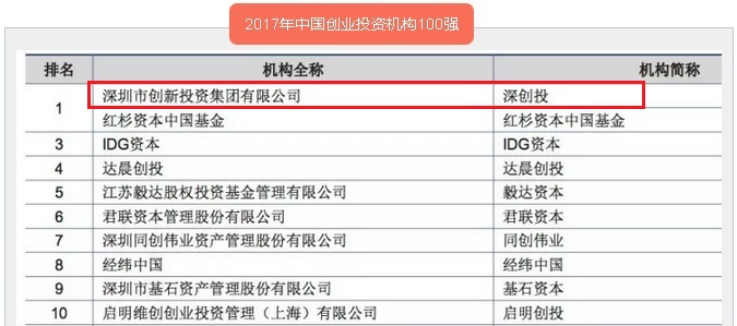 12月8日,由清科集团、投资界主办的“2017中国股权投资年度排名榜单”隆重揭晓。深圳市创新投资集团有限公司(以下简称“深创投”)荣获“2017年中国创业投资机构100强第一名”、“2017年中国最佳退出创投机构”、 “2017年中国互联网/移动互联网领域投资机构20强”、“2017年中国医疗健康领域投资机构20强”、“2017年中国消费生活领域投资机构20强”、“2017年中国清洁技术领域投资机构10强”、“2017年中国高端装备制造领域投资机构10强”、“2017年中国大数据和企业服务领域投资机构10强”等多项荣誉。