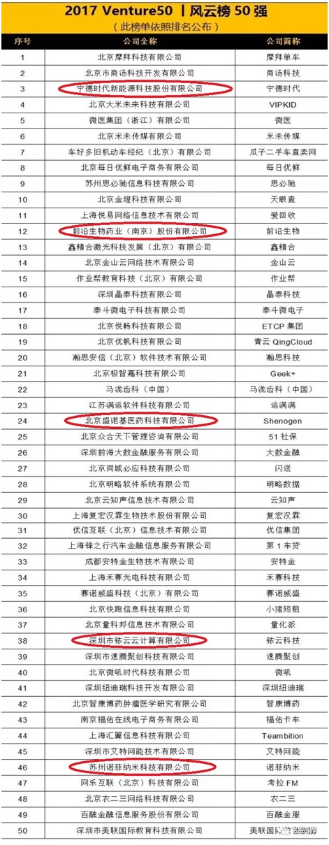 深创投投资企业宁德时代新能源科技股份有限公司(宁德时代)获评风云榜第三名;前沿生物药业(南京)股份有限公司、北京盛诺基医药科技有限公司、深圳市铱云云计算有限公司、苏州诺菲纳米科技有限公司进入前50强。