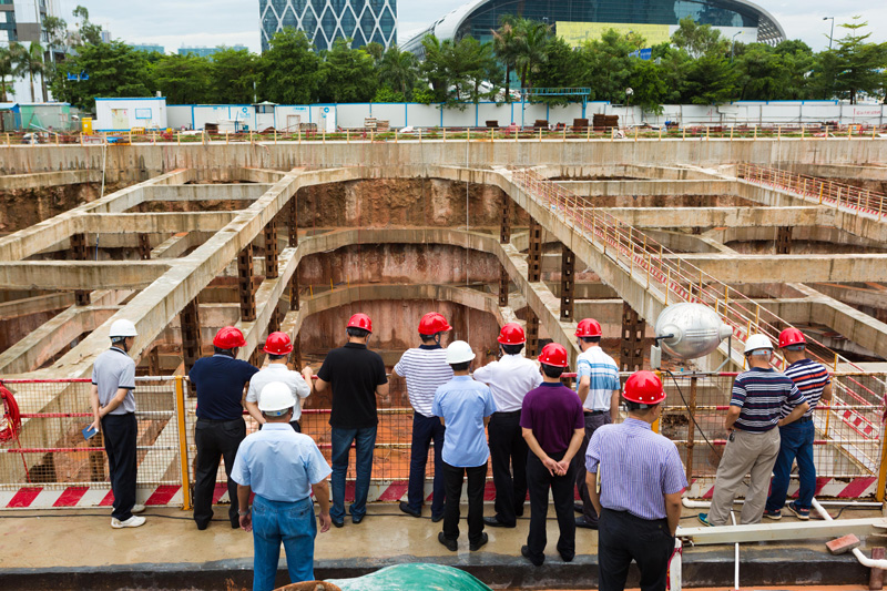 检查组首先进行了现场安全生产检查,重点对深基坑排水、南区基坑底部承台及垫层施工、北区土方挖掘及分层转运、安全走道、人行专用梯笼、基坑支撑体系受力状况和南区第4道对撑加固措施进行了仔细检查,并就基坑地下水沉降与位移对地铁11号线、周边建筑物和市政管网的影响进行了详细了解。