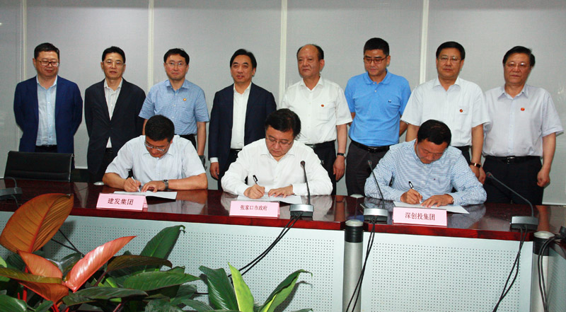 5月24日下午,张家口市委书记回建、市长武卫东率张家口市党政考察团,在深圳市国资委总经济师何建锋陪同下,莅临深圳市创新投资集团(简称“深创投”)洽谈合作事宜。深创投与张家口市政府、张家口建设发展集团有限公司(简称“张家口建发集团”)签订了战略合作协议。