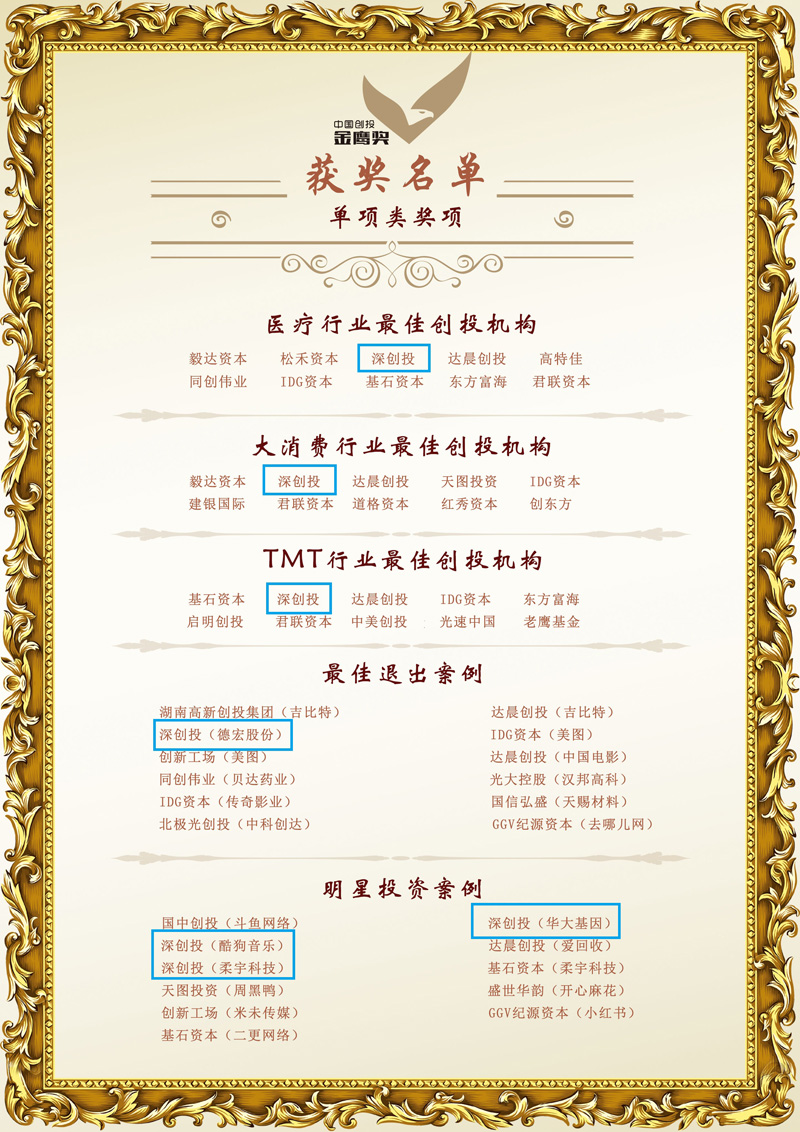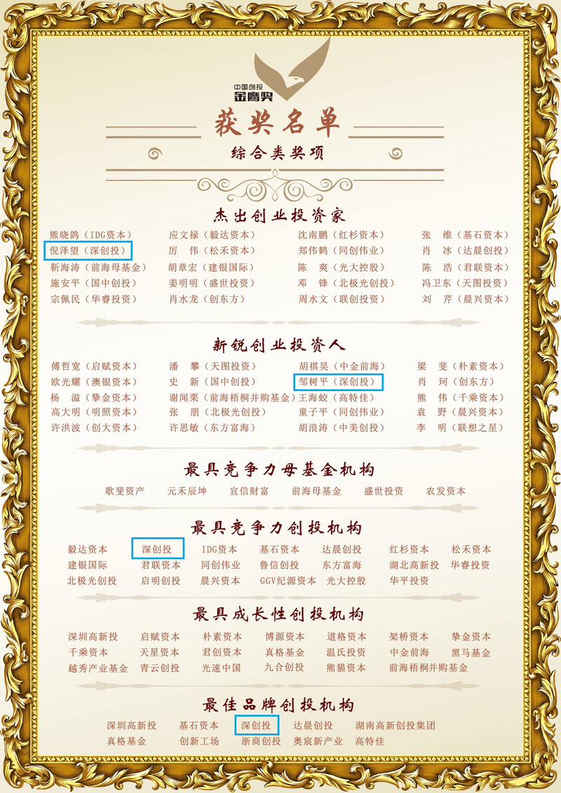 深创投集团获得奖项包括:最具竞争力创投机构、最佳品牌创投机构,医疗行业最佳创投机构、大消费行业最佳创投机构、TMT行业最佳创投机构。