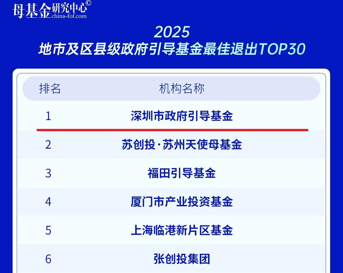 2025地市及区县级政府引导基金最佳退出TOP30第一名