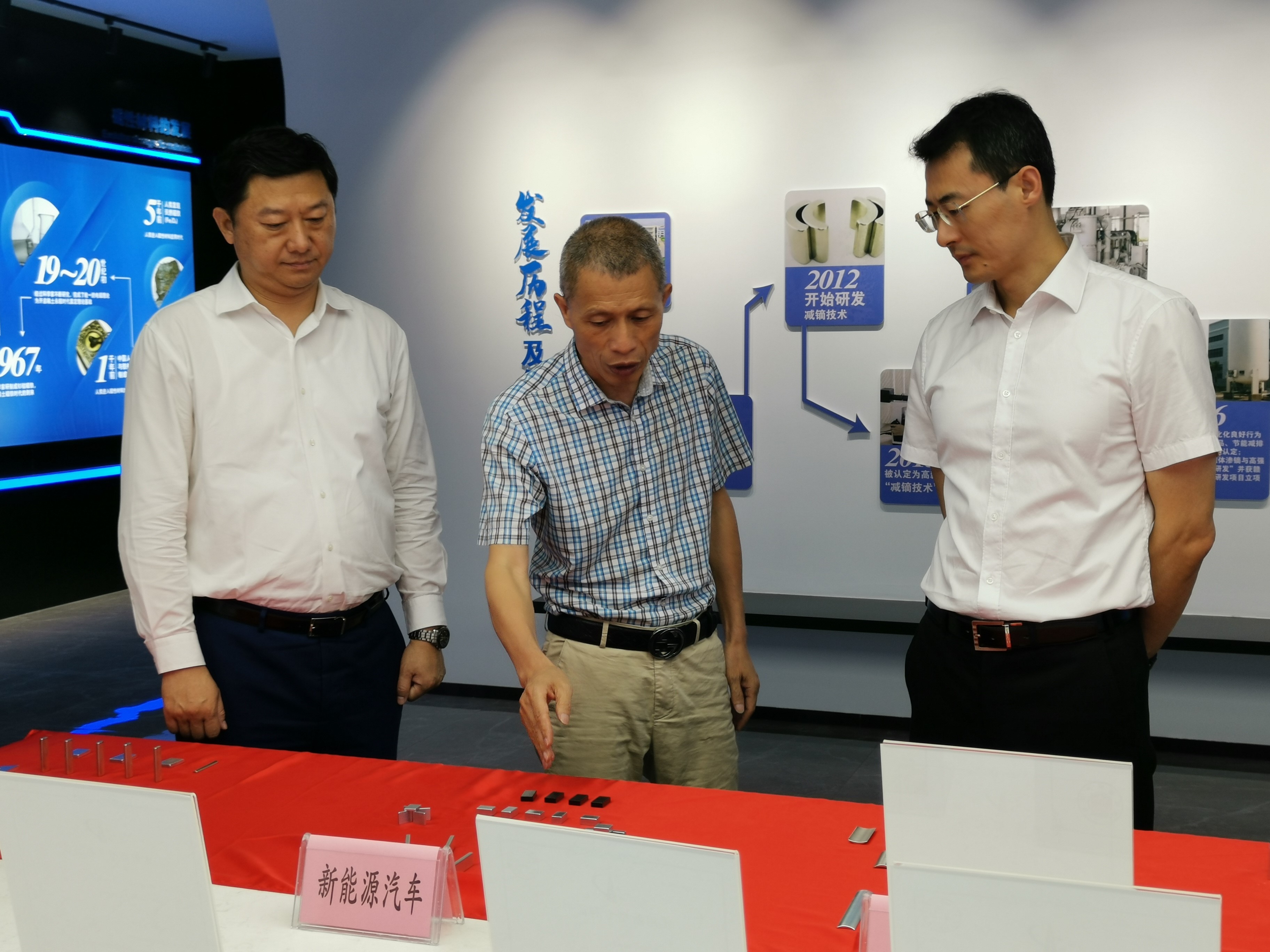 在荧光磁业,左丁总裁一行详细了解稀土永磁材料在新能源汽车、医疗器械、耐高温电机等领域的市场前景,以及技术的领先优势。