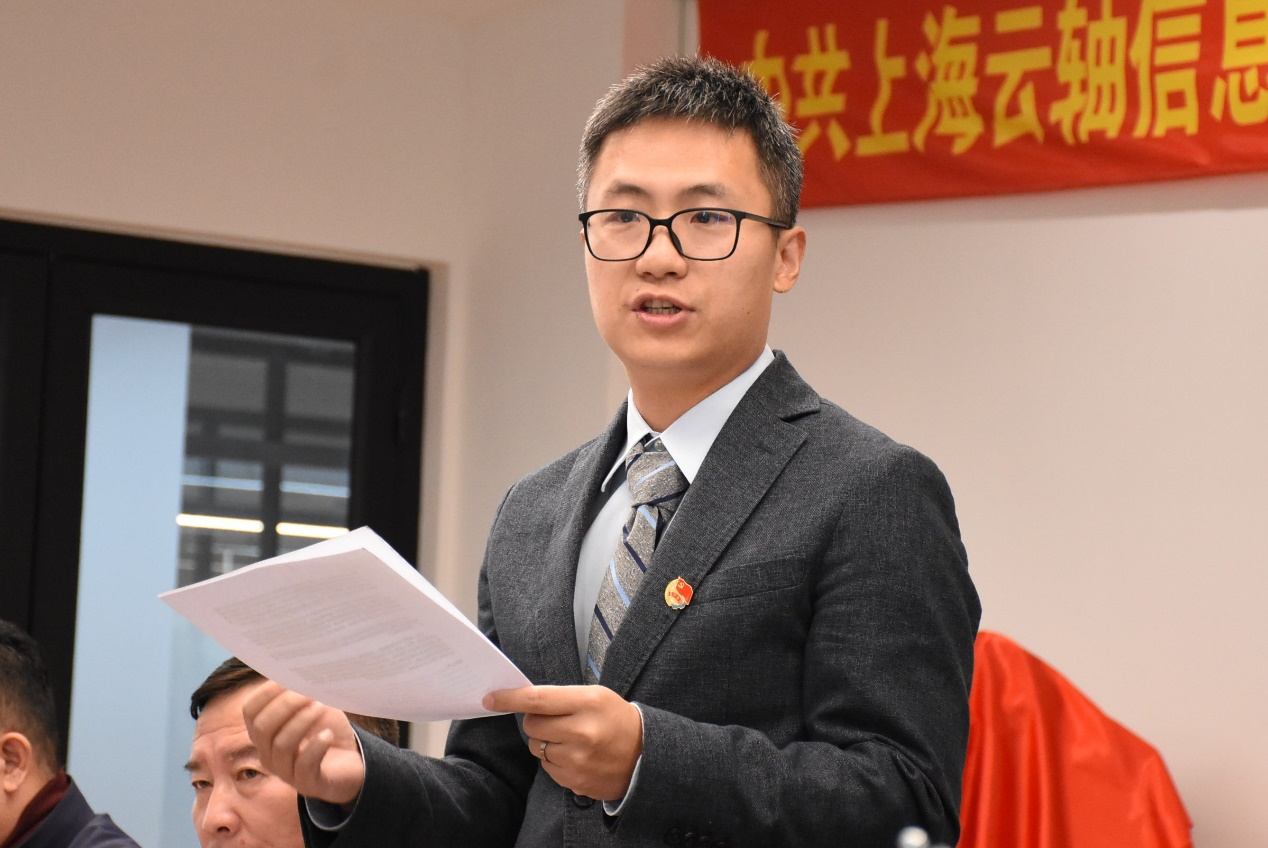 党支部成立揭牌仪式在激昂的国歌声中拉开序幕。上海云轴党支部书记尤永康介绍了公司基本情况及党支部筹建历程,并表示上海云轴党支部立志成为爱国爱党、敢打敢拼的科技先锋,未来将不忘初心、牢记使命,为国家信息科技的发展贡献力量。