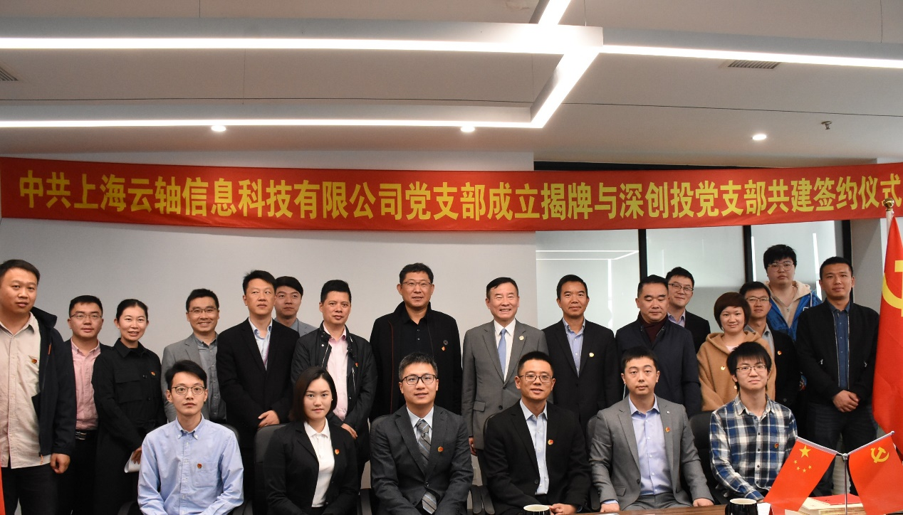 2019年11月22日,在深创投集团第二党支部的宣传和帮助下,被投企业上海云轴信息科技有限公司(以下简称“上海云轴”)党支部举办了成立揭牌暨共建签约仪式,成为深创投集团党委开展特色支部共建活动以来,推动成立的第24家被投企业党组织。深创投集团党委副书记邵钢、第二党支部书记汤明安、华东总部副总经理伊恩江、华东总部总经理助理艾兴,上海紫竹高新区党委书记、副总经理骆山鹰,以及双方党员群众代表共30多人参加了此次活动。