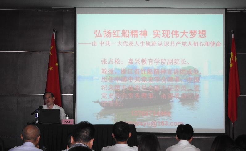 在嘉兴南湖,党员们首先聆听了《弘扬“红船精神”,实现伟大梦想》专题讲座,嘉兴教育学院副院长、原南湖革命纪念馆馆长张志松教授为大家深入解读了“红船精神”及其时代价值。“开天辟地、敢为人先的首创精神;坚定理想、百折不挠的奋斗精神;立党为公、执政为民的奉献精神”,是习近平总书记对“红船精神”的深刻论述和精准提炼。张教授指出,习近平总书记提出“红船精神”的意义不仅在于填补了中国共产党建党到大革命之间中国革命精神史的空白,更在于这座精神丰碑,深深感召和激励着人们踏石留印、抓铁有痕地推进改革发展。红船是永恒的精神宝库,值得我们不断挖掘和弘扬。张志松教授还以“十三位中共一大代表的人生轨迹”为切入点,向党员同志们讲述了“不忘初心、牢记使命”的重要性。这十三位代表中,有坚定理想百折不挠走向成功的毛泽东、董必武,有献身理想义无反顾甘洒热血的王尽美、邓恩铭、何叔衡、陈潭秋,有脱党但理想信念不变帮助革命的李汉俊、李达,也有遭遇挫折放弃理想信念幻灭的包惠僧、刘仁静,还有投机革命丧失理想沦为不耻的张国焘、陈公博、周佛海。张教授指出,有没有守住初心、有没有牢记使命,这是他们产生不同人生轨迹的关键,我们要引以为戒,要始终不忘初心、牢记使命、永远奋斗。